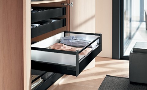 Le système Tandembox Antaro offre un grand confort de mouvement et une variété de design. La coulisse corps de meuble doit son coulissement ultra-léger aux rouleaux synthétiques à faible usure et à une capacité de charge dynamique de 30 kg ou 65 kg.